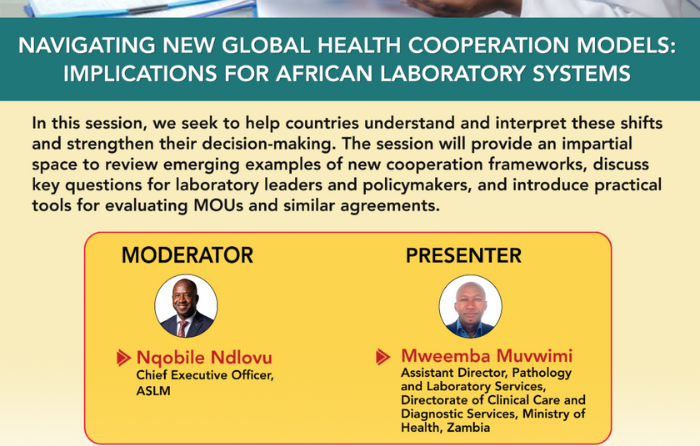 The session supports countries, laboratory leaders, and policymakers to better understand and interpret ongoing global shifts in health cooperation, with the aim of strengthening strategic and evidence-based decision-making. It provides an impartial platform to review real-world examples of new cooperation frameworks, discuss critical policy and leadership questions, and introduce practical tools for evaluating MOUs and similar agreements relevant to laboratory systems.